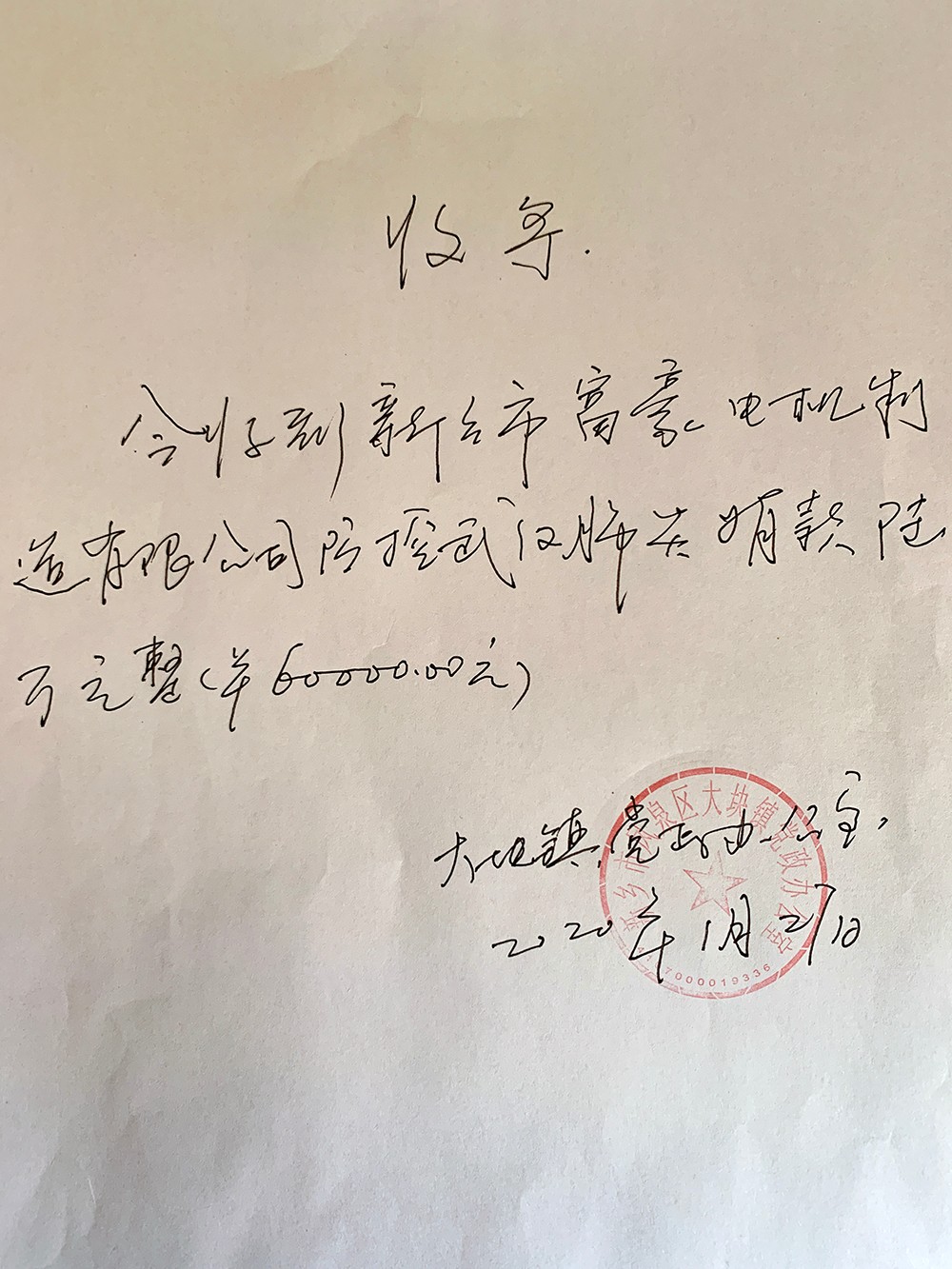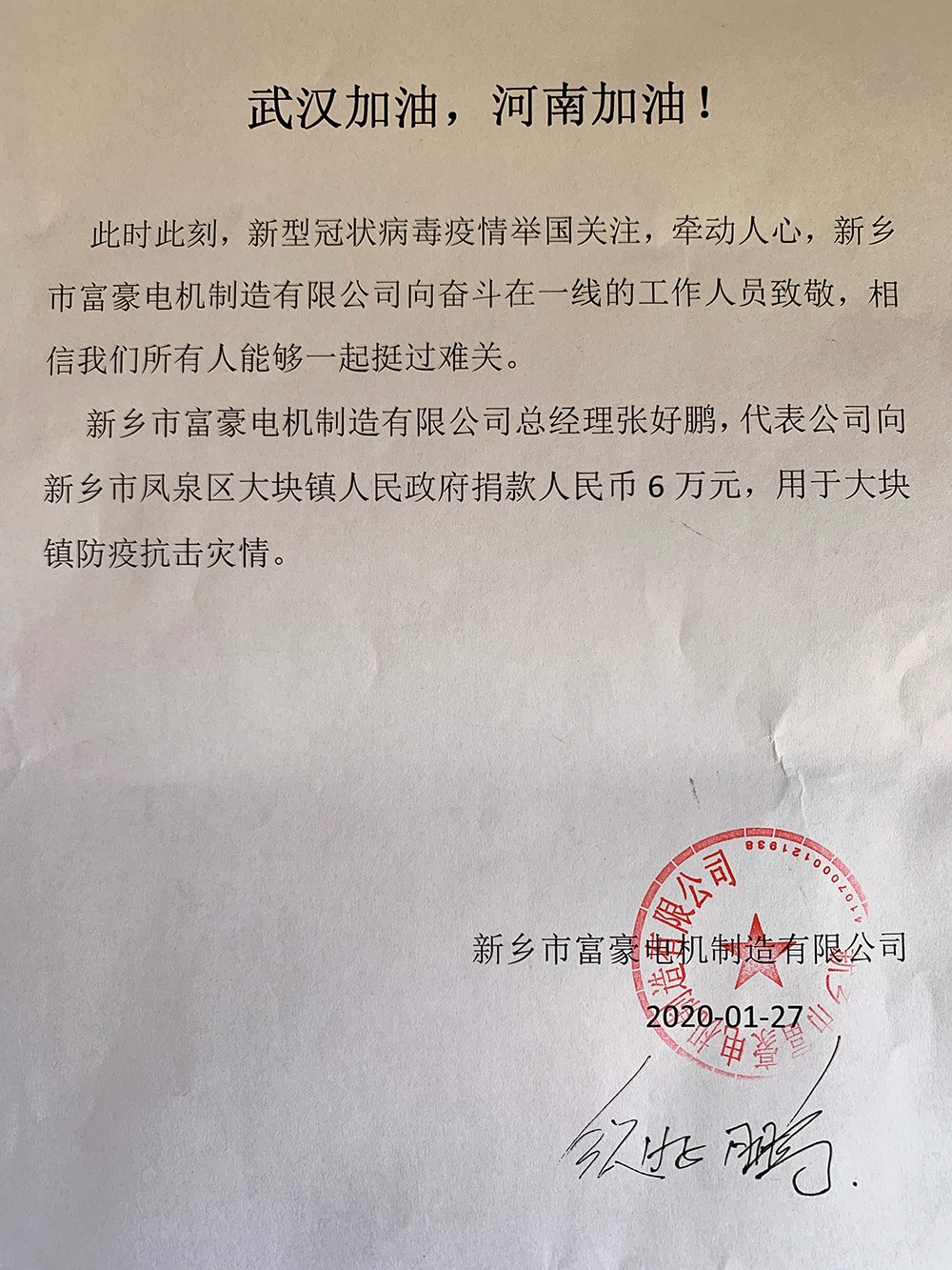 新鄉(xiāng)市富豪電機制造有限公司總經(jīng)理張好鵬,代表公司向新鄉(xiāng)市鳳泉區(qū)大塊鎮(zhèn)人民政府捐款人民幣6萬元,用于大塊鎮(zhèn)防疫抗擊災情。